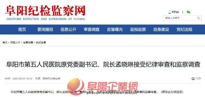 阜陽(yáng)市第五人民醫(yī)院原黨委副書(shū)記、院長(zhǎng)孟曉琳涉嫌嚴(yán)重違紀(jì)違法,目前正接受潁泉區(qū)紀(jì)委監(jiān)委紀(jì)律審查和監(jiān)察調(diào)查。(潁泉區(qū)紀(jì)委監(jiān)委) 來(lái)源:阜陽(yáng)紀(jì)檢監(jiān)察網(wǎng)